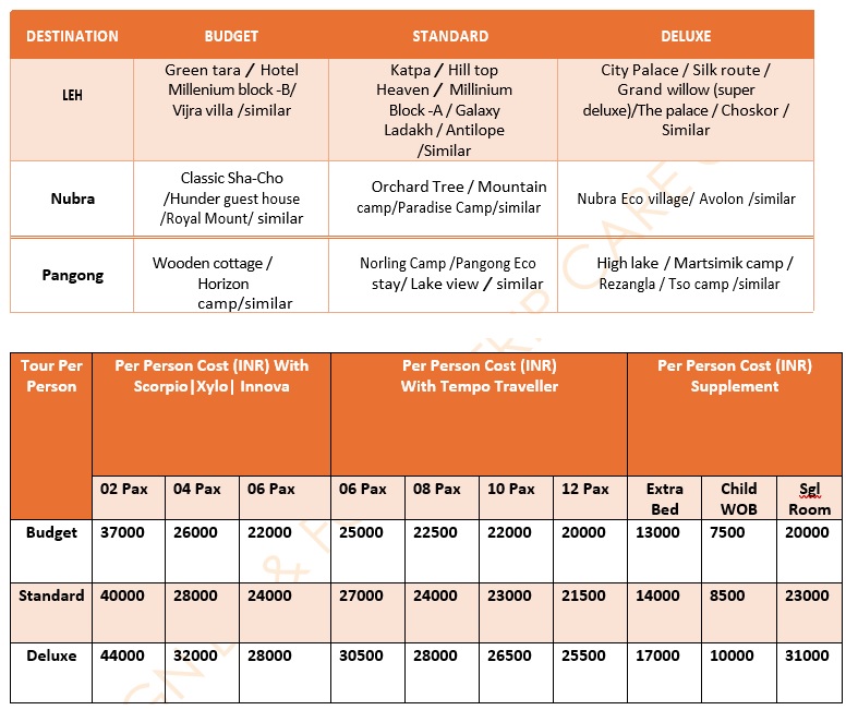 - All transfers, sightseeing & overland journey by non-air-condition Xylo, Innova or Tempo traveler in Standard & Deluxe Category (as per the option selected ) as per the programme, point to point basis , not at disposal (pick up from Leh airport till Leh airport drop)