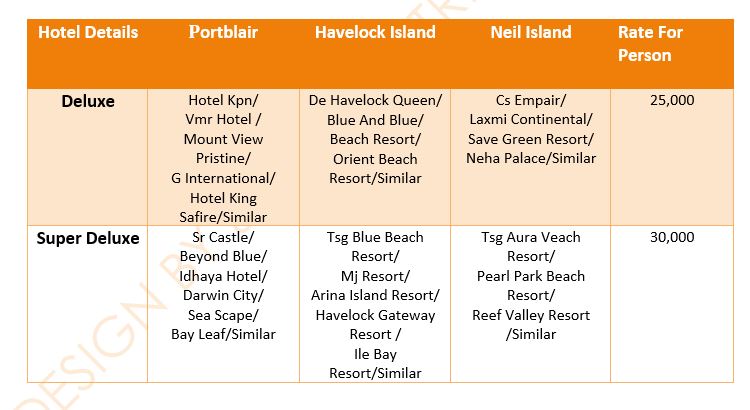 - Accommodation at Port Blair & Havelock in base room category in respective Hotel.