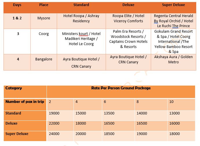 After breakfast checkout and proceed to Bangalore. En-route visit Dubare Elephant Camp (Elephant ride extra on direct payment basis) and Kaveri Nisargadhama (island formed by river Kaveri) to board your train or flight.