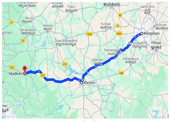 Distance between Coorg to Bangalore is 270 Kms (6 hours) by road