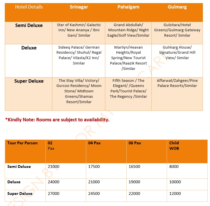 - 03 Nights stay in a hotel at Srinagar