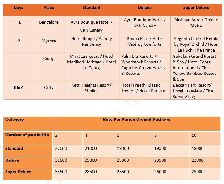 On arrival in Bangalore, meet and greet at Airport / Railway Station. Transfer to hotel and check-in. After freshen up, proceed for local sightseeing including Lalbagh Botanical Garden, Cubbon Park and Bangalore Palace. Evening free for leisure or shopping.