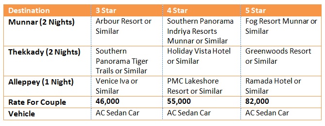 After check out from the Hotel and drive to Cochin Airport / railway station (depend on your departure place) for your flight / train back home, feeling contented about a wonderful holiday you spent in the God's Own Country.