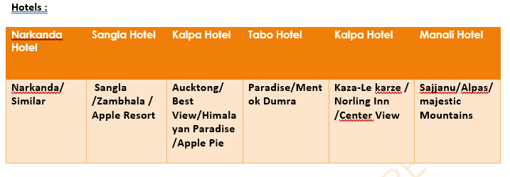 After breakfast, drive to Chandigarh via the scenic Kullu Valley.Drop at Chandigarh Airport/Railway Station for onward journey with beautiful memories of Spiti & Kinnaur.